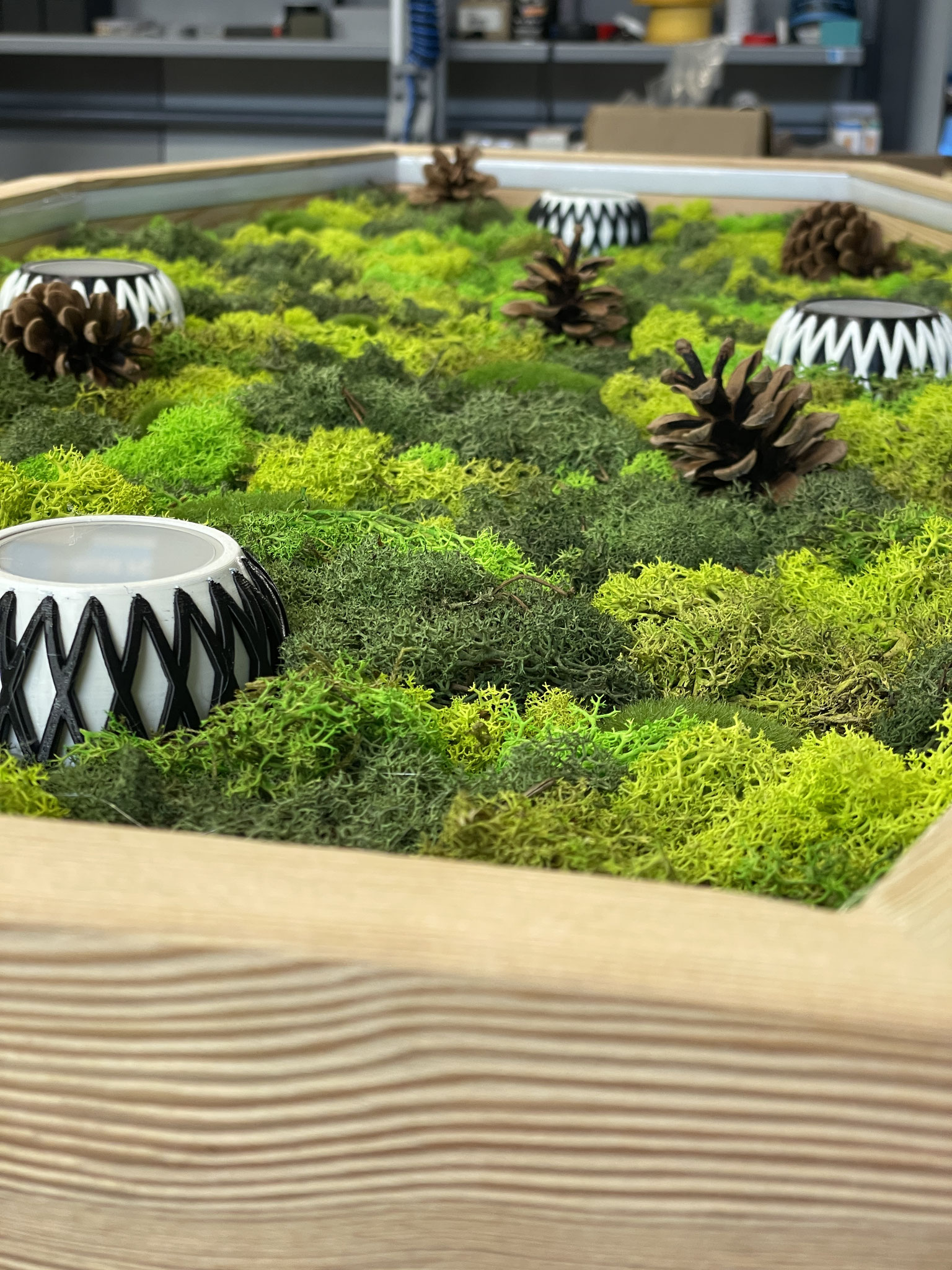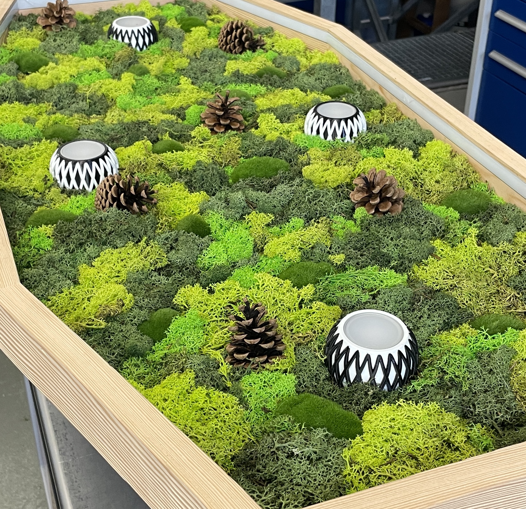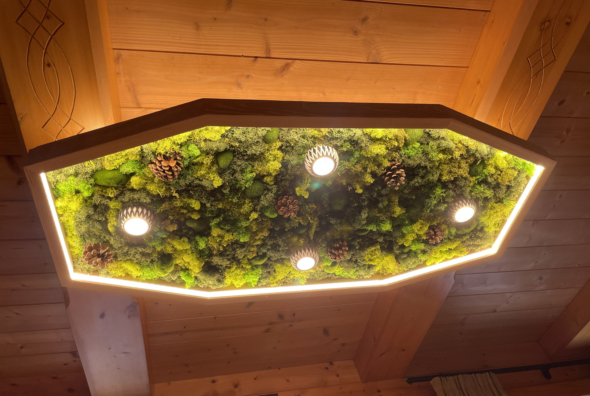 Diese handgefertigte Deckenlampe verbindet warmes Holz mit einer dekorativen Moosfläche, die durch unterschiedliche Grüntöne und natürliche Elemente wie Tannenzapfen lebendig wirkt. Integrierte LED-Spots sorgen für eine angenehme, direkte Beleuchtung, während die umlaufende LED-Lichtlinie ein stimmungsvolles, indirektes Ambiente schafft.