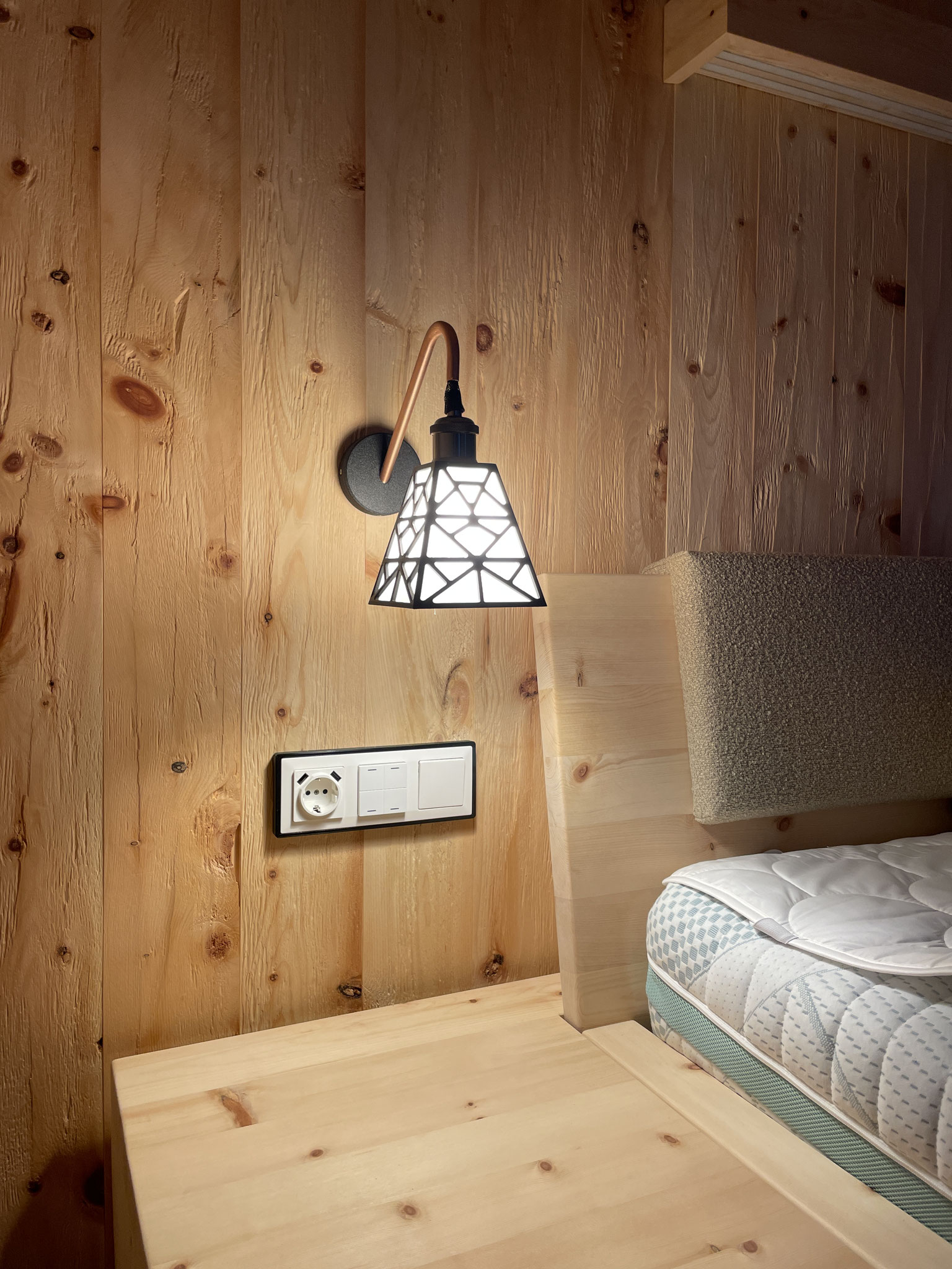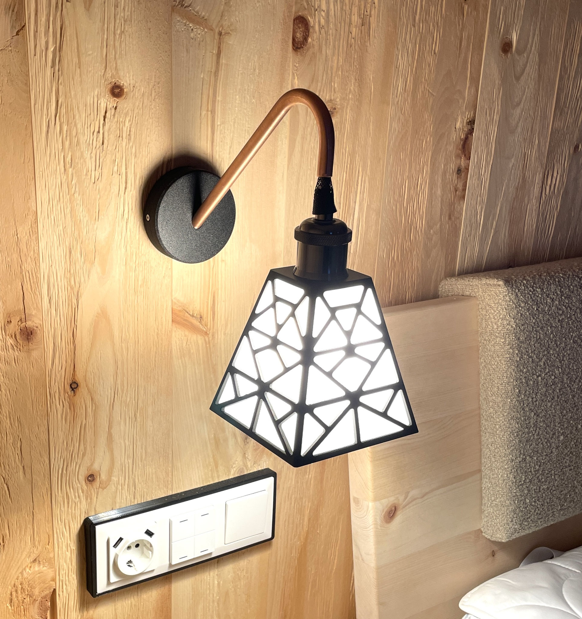 Der geschwungene Arm und die klaren Linien machen die Lampe zu einem harmonischen Blickfang – ideal für Schlafzimmer, Chalets, Ferienwohnungen oder gemütliche Wohnbereiche.